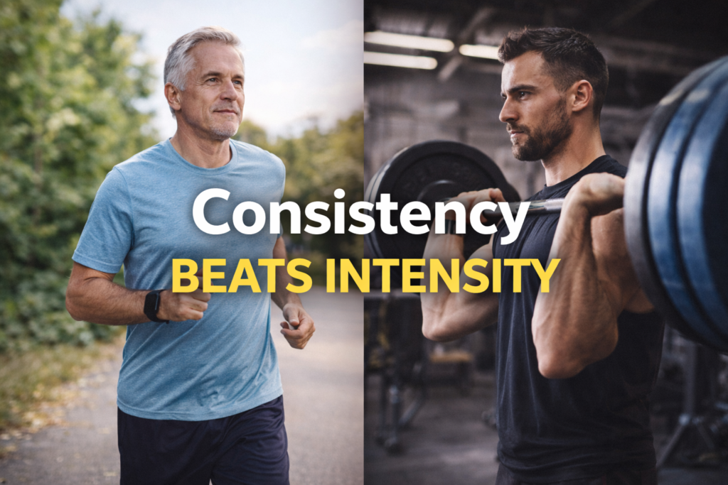 Consistency Beats Intensity The longevity lesson that matters more than any workout plan. Part of: Foundations Hub Explore: Movement •